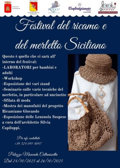 Si svolgerà dal 24 Ottobre al 26 Ottobre 2025 il “Festival del ricamo e del merletto siciliano”, una manifestazione che, nell’elegante location del Palazzo Moncada, riunirà numerose attività, tutte legate insieme da un unico filo conduttore: la preziosa arte del “fatto a mano”.