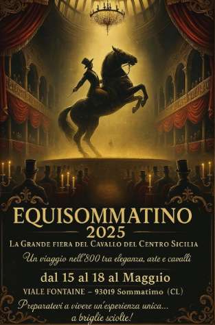 Sommatino si prepara ad accogliere uno degli eventi equestri più suggestivi e attesi della stagione: Equisommatino 2025. Dal 15 al 18 maggio, il cuore della Sicilia tornerà a battere al ritmo degli zoccoli, in una fiera che unisce passione, cultura e spettacolo. L’obiettivo è ambizioso: offrire agli appassionati di cavalli un’esperienza unica che fonde la tradizione equestre con un’atmosfera raffinata e teatrale ispirata all’ottocento. Uno spettacolo totalizzante, elegante, emozionante. L’appuntamento è dal 15 al 18 maggio, a Sommatino (CL), Viale Fontaine.