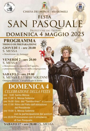 MUSSOMELI – Varato dal rettore della chiesa dei Monti Padre Achille Lomanto e dal presidente della Congregazione Alessandro Noto il programma religioso in onore di San Pasquale Baylon. Le celebrazioni incominciano già dal prossimo giovedì con un triduo di preparazione in onore del Santo Protettore dei pastori, che si venera, appunto, nell’anzidetta chiesa. Il programma prevede la celebrazione della messa alle ore 20 con la benedizione dei formaggi, nei due giorni successivi, la benedizione dei pastori, dell’agnello, e presentazione dei novizi della congregazione; sabato, Messa e Vespri solenni alla ore 19. Domenica, 4 maggio, celebrazioni di messe alle ore 9 – 11 e 19; alle ore 16, giro dei tamburinari di Cammarata e alle ore 17 ritiro del Palio dall’abitazione del presidente. Alle 20 è prevista la processione del simulacro di San Pasquale.