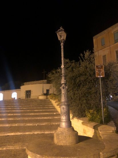 Ebbene, questa piazza da molti giorni, risulta con i 4 lampioni spenti su 4, con ben tre cappelle completamente al buio in particolare la cappella centrale, con l’umidità che ha rovinato la cappella della stazione n° 8, con tutti i fari, ai piedi delle 14 cappelle fulminati, o comunque spenti, con alcune targhe degli autori esposte nei muri esterni che sono state vandalizzate, con gli ulivi decorativi non potati da anni e con la piazza piena di tantissima sporcizia e degrado e tutto questo, ironia della sorte, proprio negli stessi giorni in cui l’Amministrazione comunale si vantava di avere riportato la pulizia in Città.