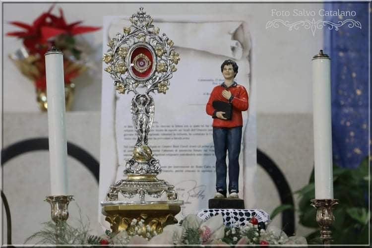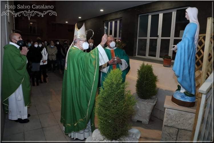 MUSSOMELI – Messa domenicale pomeridiana delle 18,30 nella Parrocchia di Cristo Re, quella appena trascorsa, presieduta dal Vescovo della diocesi mons. Mario Russotto a cui hanno partecipato i diaconi don Salvatore Cardulo e don Pierenzo Costanzo. Presenti alla celebrazione, i presbiteri don Liborio Franzù e don Salvatore Falzone, rispettivamente parroco di Cristo Re e parroco della Parrocchia della B. V. Maria del Monte Carmelo. La celebrazione domenicale vespertina è stata l’occasione per il Vescovo Russotto di presentare, ai fedeli presenti, la Reliquia del Beato Carlo Acutis, soffermandosi sulla sua figura. Il Vescovo ha, poi, benedetto la piccola statua della Madonna Miracolosa, sistemata all’esterno, vicino al campetto, dove è ben visibile l’immagine del giovane Beato Carlo Acutis.