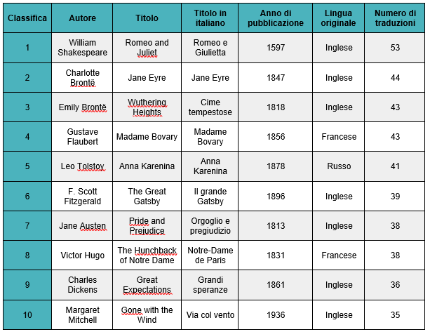 Al primo posto troviamo il dramma romantico per eccellenza: “Romeo e Giulietta”, tragedia ambientata nella Verona del cinquecento, è stato tradotto in ben 53 lingue diverse, tra cui il curdo e la lingua tigrina.