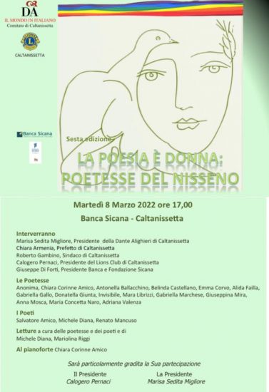 “La poesia è donna – Poetesse del nisseno” si svolgerà dalle ore 17,00 nel salone della Banca Sicana.