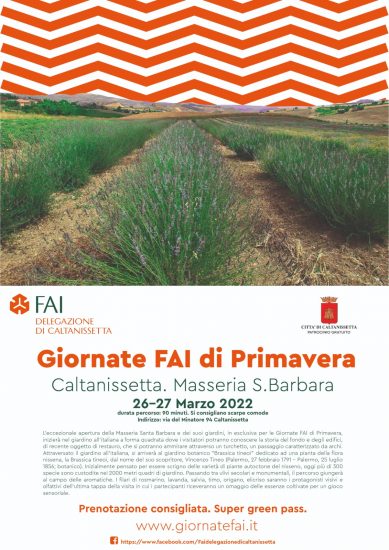 A Caltanissetta ci sarà l’eccezionale apertura della Masseria Santa Barbara e dei suoi giardini: si partirà dal giardino all’italiana a forma quadrata dove i visitatori potranno conoscere la storia del fondo e degli edifici, di recente oggetto di restauro, che si potranno ammirare attraverso un turchetto, un passaggio caratterizzato da archi. Attraversato il giardino all’italiana, si arriverà al giardino botanico “Brassica tineoi” dedicato ad una pianta della flora nissena, la Brassica tineoi, dove sono custodite più di 300 specie. Passando tra ulivi secolari e monumentali, il percorso giungerà al campo delle erbe aromatiche: protagoniste visive e olfattive dell’ultima tappa della visita, in cui i partecipanti riceveranno un omaggio delle essenze coltivate per un gioco sensoriale.