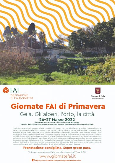 Altra iniziativa in programma “Passeggiando a Gela. Gli alberi, l’orto, la città”: dalla scoperta della Chiesa del Carmine fino al polmone verde della Villa Comunale. Nell’ottica di valorizzare un’area cittadina dalle grandi potenzialità ambientali, posta a cerniera tra il centro storico federiciano e il mare, il percorso si concluderà con la spiegazione di un nascente progetto di rigenerazione urbana dell’Orto Pasqualello che prevede il recupero di un anfiteatro, la creazione di percorsi pedonali e ciclabili, la ricostituzione della biodiversità e della salvaguardia delle specie arboree del luogo, nonché la creazione di terrazzamenti volti alla coltivazione di orti privati con fontane e giochi d’acqua. Per entrambe le iniziative è consigliata la prenotazione (tramite il sito www.fondoambiente.it) così come il super green pass.