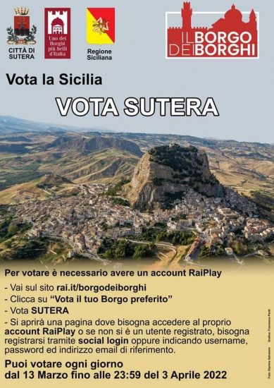 Riceviamo e pubblichiamo il comunicato stampa congiunto tra l’ Amministrazione Comunale di Sutera e i Borghi più Belli D’Italia in Sicilia. Sutera, Uno dei Borghi più belli d’Italia, quest’anno è l’unico paese a rappresentare la Sicilia al concorso “Borgo dei Borghi” su Rai 3 nella trasmissione “Kilimangiaro”. Sutera è un Borgo di antiche origini che domina le colline sottostanti e la valle del Platani. L’abitato si sviluppa formando una corona alle pendici del Monte San Paolino (823 mt). Tre sono i quartieri che si ergono attorno al monte: il Rabato, il Rabatello di origine araba e il Giardinello di origine normanna. Grazie a questi quartieri millenari, in particolare al Rabato sede del Presepe vivente, dal 2014 Sutera è entrato a far parte dell’Associazione “I Borghi più belli d’Italia” attestando tanta visibilità ed importanza a livello nazionale e internazionale. Da giorno 13 marzo sono aperte le votazioni per eleggere il “ Borgo dei Borghi 2022” e si può esprimere un voto al giorno fino al 03 aprile 2022 su Raiplay, tramite il link dedicato. Sutera, quindi, concorre a diventare “Borgo dei Borghi” in rappresentanza della Sicilia. VOTA SUTERA, VINCE LA SICILIA INTERA. Il Sindaco Giuseppe Grizzanti e Il presidente dei borghi più belli d’Italia in Sicilia Salvatore Bartolotta https://www.rai.it/borgodeiborghi/Vota-il-tuo-Borgo-dei-Borghi-2022-3c2b52ac-93ea-4fd2-9f01- d5f8b4fa4fa3.html