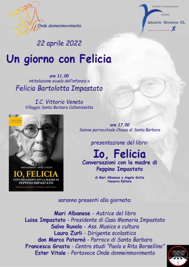 Al mattino ci sarà una ristretta cerimonia per l’intitolazione della Scuola dell’Infanzia a Felicia Bartolotta Impastato. Questa intitolazione è stata fortemente voluta dall’Associazione Onde donneinmovimento nella consapevolezza che dedicare scuole ma anche strade e piazze alle donne serve a favorire non solo un processo di riconoscimento ma anche di conoscenza della storia delle donne che hanno fatto il nostro Paese. E, senza dubbio, Felicia Bartolotta è un esempio di coraggio e determinazione. Alla cerimonia prenderanno parte anche Maria Luisa Impastato, nipote di Felicia, e la scrittrice Mari Albanese che, insieme ad Angelo Sicilia, ha racchiuso e pubblicato in un libro mesi e mesi di conversazioni avute con Felicia. Il libro che si intitola “Io, Felicia. Conversazioni con la madre di Peppino Impastato” ediz. Navarra, sarà presentato nel pomeriggio alle 17.00 nel salone parrocchiale della Chiesa di Santa Barbara locale della Chiesa Parrocchiale.