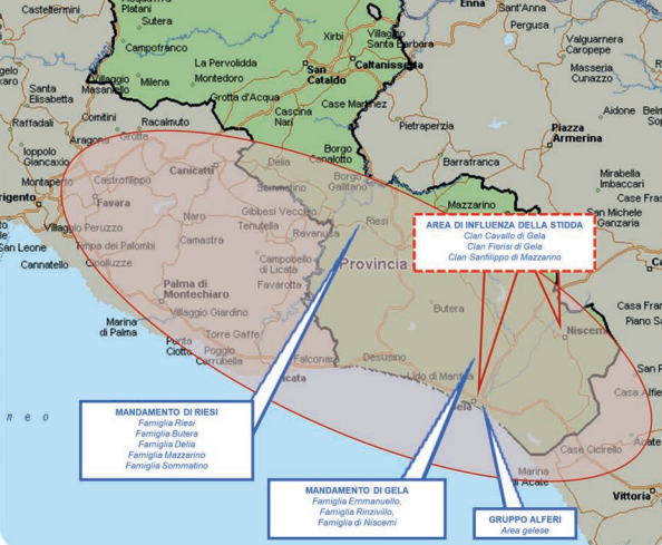 L’articolazione di cosa nostra nissena rimane invariata. Nella parte settentrionale della provincia si rilevano i mandamenti di MUSSOMELI95 e di VALLELUNGA PRATAMENO sotto l’influenza dei MADONIA. Sul versante meridionale si registrano quelli di RIESI e GELA. Nell’ambito di quest’ultimo oltre alla famiglia di NISCEMI operano le locali famiglie di cosa nostra degli EMMANUELLO e dei RINZIVILLO.