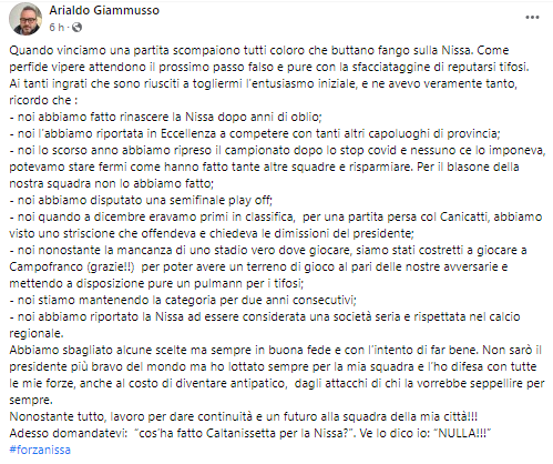 Dopo la vittoria ottenuta mercoledì dalla Nissa contro il Casteltermini per 2 a 1 sul neutro di Campofranco, il presidente Arialdo Giammusso ha affidato i suoi tellurici pensieri ad un rovente post su facebook.