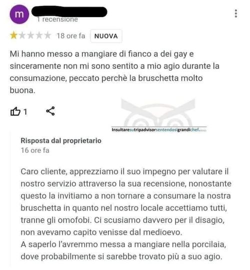 La replica del locale – “Caro cliente, apprezziamo il suo impegno per valutare il nostro servizio attraverso la sua recensione, nonostante questo la invitiamo a non tornare a consumare la nostra bruschetta in quanto nel nostro locale accettiamo tutti, tranne gli omofobi. Ci scusiamo davvero per il disagio, non avevamo capito che venisse dal Medioevo.