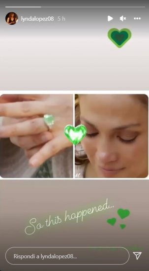Anche la sorella di JLo, Lynda Lopez, ha pubblicato nel suo feed di Instagram una foto del famoso anello e il volto della cantante commosso. “Quindi sta accadendo”, ha commentato sibillina, dando ulteriore credito dall’ipotesi delle nozze in vista. La pietra potrebbe essere uno smeraldo o un rarissimo diamante verde, un colore che Jennifer ritiene il suo porta fortuna.