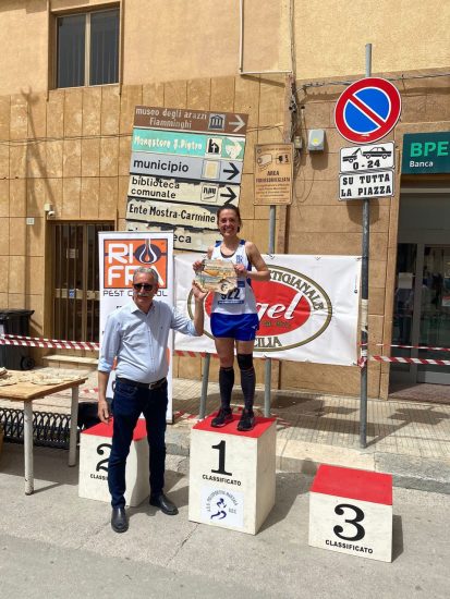 Indelebile ed impetuoso rientro di Angela La Monica; l’atleta in pausa da diverso tempo, a causa di un infortunio, ha ripreso a gareggiare con ritmi da grande campionessa. Costantemente seguita dal coach Francesco Augello, Angela, non ha mostrato alcun segno di cedimento per tutti i 21,097 Km, seppur affiancata dalla Bilello (Universitas Palermo); per lei il gradino più alto del podio con un tempo di 01h27’59’’, migliorato di circa un minuto rispetto alla precedente partecipazione. Un primo posto che ha invaso di gioia tutti i componenti della squadra, che non hanno mai smesso di credere in lei e alle sue strepitose capacità.