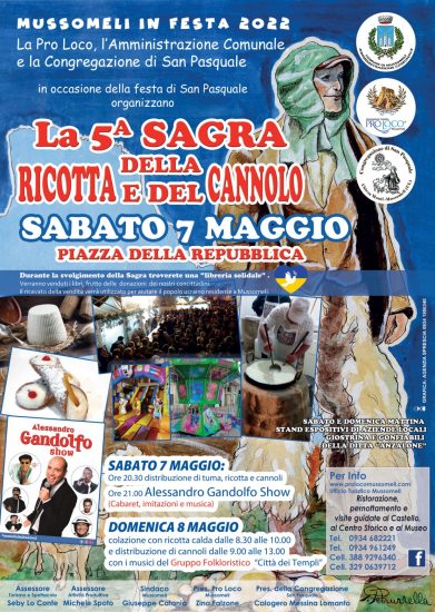 MUSSOMELI – E’ terminata l’emergenza Covid ed è già “sagra” con la promozione turistica e gastronomica del Vallone. Ritorna la tradizionale Sagra della Ricotta e del CANNOLO, prevista per il 7 e l’ 8 Maggio, ferma da due anni alla sua 4^ edizione, e l’amministrazione comunale, la Proloco e la Congregazione San Pasquale hanno diffuso il programma. Trattasi di un evento di folklore, gastronomia e spettacoli, ma i “protagonisti” assoluti saranno, come sempre, la ricotta, la tuma, i cannoli e i formaggi, appunto per la loro valorizzazione. La ricotta fresca è, infatti,uno dei prodotti tipici per eccellenza del nostro paese. La tradizione di allevatori locale ha sviluppato, nel corso degli anni, una forte specializzazione nel settore dell’allevamento degli animali da latte, della produzione di formaggi di varia natura. “Oggi, la ricotta e i formaggi di Mussomeli – commenta l’assessore al turismo Seby Lo Conte ” – trovano apprezzamento anche oltre i confini dell’Isola, e lo straordinario successo di questi prodotti ha offerto lo spunto per riprendere, dopo circa 30 anni, una sagra ad essi dedicata”.