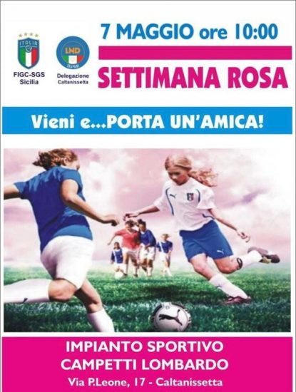CALTANISSETTA – Inziativa della LND Delegazione Provinciale Caltanissetta per incentivare la pratica del calcio da parte delle ragazze. L’appuntamento è fissato per sabato 7 maggio dalle ore 10:00 presso i Campetti Lombardo nel capoluogo nisseno: in programma la manifestazione “Settimana Rosa”, un open day dedicato al Calcio Femminile.