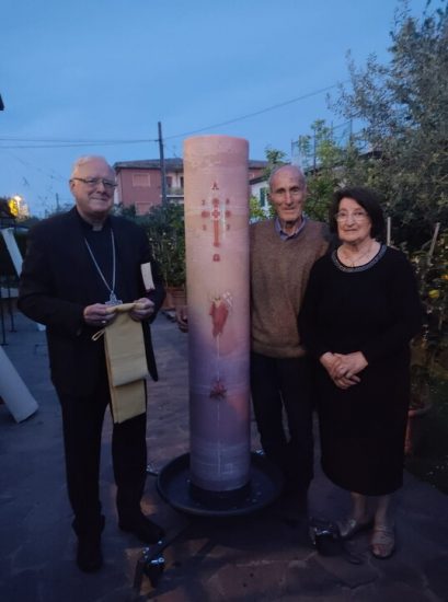 Protagonisti di questo viaggio benefico l’82enne Sauro Innocenti (che ha creato il cero) e sua moglie Carla Bianchini, 78, di Chiesina Uzzanese, in provincia di Pistoia, presepisti dell’Associazione Terre dei Presepi. “E’ un pellegrinaggio che volevamo fare a piedi ma alla fine eccoci qui: 1.248 chilometri con ape cargo corrispondono a 12.480 fatti in auto”, il primo commento della coppia una volta arrivata a destinazione il 9 maggio.