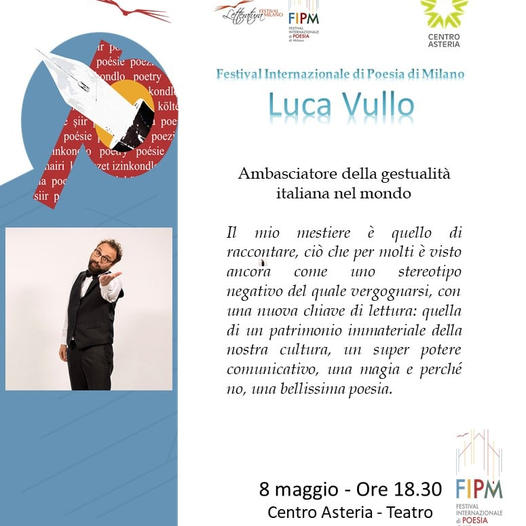 Milano 8 maggio alle ore 18:30 Luca Vullo sarà presso il Teatro del Centro Asteria di Milano per il Festival Internazionale di Poesia, che dal 2016 ha lo scopo di riunire tutte quelle voci che danno forma al “timbro culturale” di una città. Poesia scritta, parlata, respirata, danzata, musicata, recitata, dipinta.