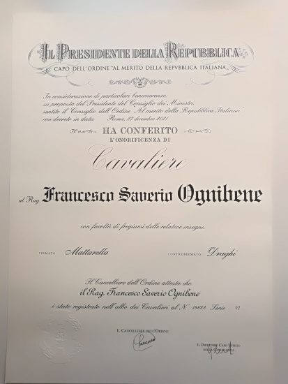 MUSSOMELI – Lo scorso 2 giugno, in occasione dei festeggiamenti per il 76esimo anniversario del referendum in cui cominciò la storia repubblicana, il nostro concittadino Saverio Ognibene ha ricevuto il titolo di Cavaliere dell’Ordine al merito della Repubblica Italiana, per essersi distinto in ambito lavorativo e sociale. L’onorificenza è stata concessa con Decreto del Presidente della Repubblica Sergio Mattarella datato 27 dicembre 2021, su proposta del Presidente del Consiglio dei Ministri Mario Draghi, sentito il Consiglio dell’Ordine. La cerimonia di consegna del titolo è avvenuta nel cortile del Palazzo di Governo della Città di Lodi, alla presenza del Prefetto di Lodi e delle autorità civili, militari e religiose. Questa la motivazione letta al momento della consegna dell’onorificenza: “Cavaliere Francesco Saverio Ognibene, Funzionario in servizio presso la locale Prefettura dal 1996, nell’espletamento del proprio servizio ha sempre dimostrato encomiabili qualità, attaccamento al lavoro, spirito di abnegazione e competenza. Sin dagli inizi della pandemia, quando a seguito del diffondersi del primo focolaio di Codogno è stata istituita la prima zona rossa con provvedimento del Presidente del Consiglio dei Ministri, ha prestato la sua attività lavorativa evidenziando elevatissime qualità professionali, nel momento in cui la Prefettura ha svolto un ruolo di raccordo e di supporto agli Enti Locali, alle Forze dell’Ordine e alle Autorità sanitarie. Il continuo lavoro, la disponibilità mai negata, la professionalità sono stati motivo di apprezzamento anche da parte di tutti gli attori esterni coinvolti nella gestione emergenziale.”