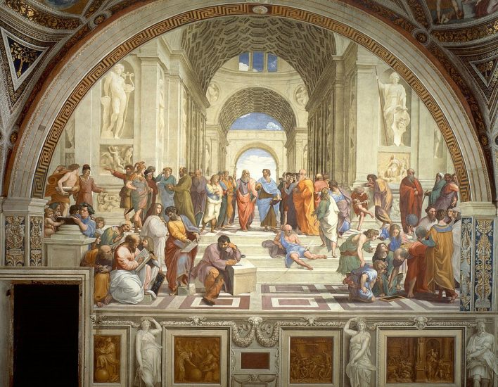 Nella prima delle due immagini qui presentate la “Scuola di Atene”: celeberrimo affresco del divino Raffaello Sanzio. Affresco che possiamo trovare nella Stanza della Segnatura, una delle quattro Stanze Vaticane poste all’interno dei Palazzi Apostolici. Indubbiamente una delle opere pittoriche più rilevanti dei Musei Vaticani. La “Scuola di Atene” esalta la ricerca razionale: inquadrato da un grande arco, l’affresco rappresenta i più celebri filosofi e matematici dell’antichità – tra cui Platone e Aristotele – intenti a dialogare tra loro, all’interno di un immaginario, monumentale edificio classico, rappresentato magistralmente secondo i canoni della prospettiva rinascimentale.