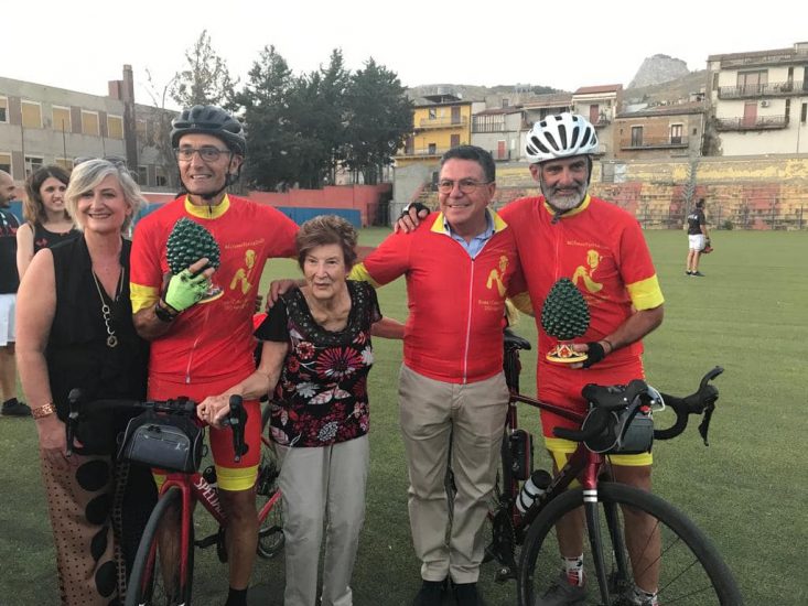CAMPOFRANCO. Una pedalata lunga 1.000 km quella di Rino Virciglio e dell’amico Alberto Ercoli che, dopo una lunga traversata in bici durata cinque giorni da Roma arrivano a Campofranco, dove sono stati accolti dai familiari, amici ed alcuni miei collaboratori. Dopo averli salutati ho subito consegnato loro un dono di benvenuto: due pigne in ceramica, che sono simbolo di forza vitale e di fortuna che ci auguriamo per tutti.