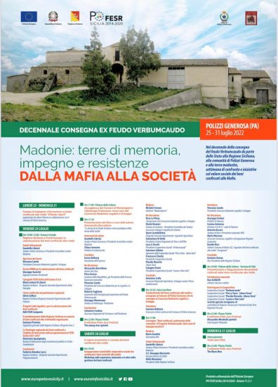 Nel decennale della consegna del Feudo Verbuncaudo da parte dello Stato alla Regione Siciliana, alla comunità di Polizzi Generosa e alla terra madonita, settimana di confronto e iniziative sul valore sociale dei beni confiscati alle Mafie. A Polizzi Generosa dal 25 – 31 luglio 2022.