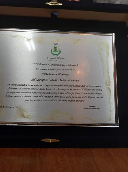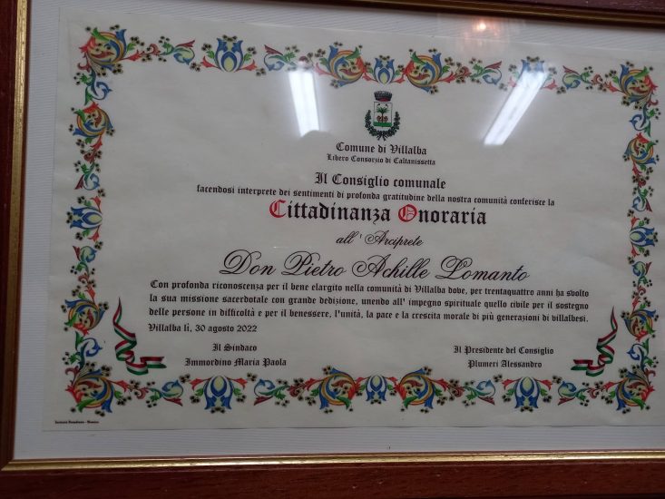 VILLALBA – Nel pomeriggio di oggi, 30 agosto 2022 alle ore 17, presso l’aula consiliare del Comune di Villalba, presieduto dal presidente Alessandro Plumeri, presente il sindaco Maria Paola Immordino e la sua giunta al completo nonché i consiglieri, si è riunito il consiglio comunale che ha conferito la “cittadinanza onoraria” all’Arciprete – parroco Padre Achille Lomanto, che lascia la comunità villalbese dopo 34 anni di esercizio del suo ministero pastorale. Il sacerdote ha ringraziato e sono seguiti gli applausi da parte di tutti i presenti, compreso il numeroso pubblico. E’ stata consegnata una pergamena del consiglio comunale a firma del suo presidente, Alessandro Plumeri, ed una targa con dedica dove si legge: “Il Sindaco e l’Amministrazione Comunale con sentimento di profonda gratitudine conferiscono CITTADINANZA ONORARIA All’Arciprete Padre Achille Lomanto con eterna gratitudine per la dedizione ed impegno ineccepibile nella cura pastorale della nostra parrocchia. Mai prima di adesso la costanza del suo lavoro e lo zelo evangelico ha relegato a Villalba anni di viva partecipazione ecclesiastica e cura certosina della nostra chiesa. Non per ultimo il restauro della Chiesa Madre rimarrà a perenne ricordo della sua vita in amore per la nostra parrocchia. Il Signore conceda ogni benedizione e grazia a Lei e alla nostra gente in aeternum. Villalba 30 agosto 2022 Il sindaco Maria Paola Immordino” Al riguardo, tanti gli apprezzamenti sul social, fra cui quello di un internauta che ha così postato: “Cittadinanza meritata. Ha fatto molto per la chiesa Villalbese e per il paese”. Intanto, domani pomeriggio, alle ore 18,30, presenti il Vescovo mons. Mario Russotto, le autorità civili e militari, le confraternite, congregazioni ed associazioni, nella chiesa madre di Mussomeli, ci sarà l’insediamento del nuovo Arciprete parroco, nella persona del mussomelese, appunto, Padre Achille Lo Manto, che succede a don Pietro Genco