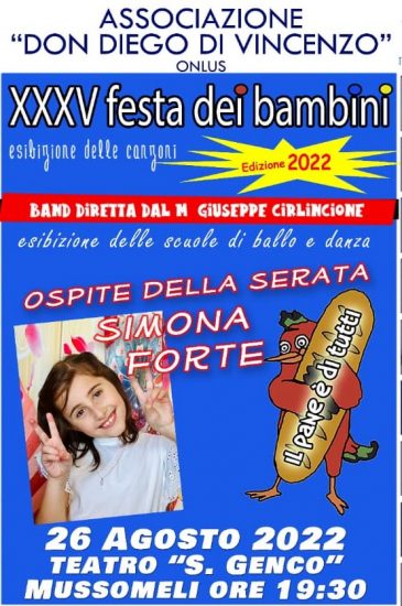 MUSSOMELI – Appuntamento al Parco Urbano “S. Genco”, domani sera alle ore 19,30, per la Festa dei Bambini”, organizzata dall’Associazione Don Diego Di Vincenzo Onlus Ed arrivata alla sua 35°edizione. Una iniziativa dal sapore solidaristico che trova ampia adesione per le note finalità: “Bimbi Felici – Il pane è di tutti”. Tanti i bambini partecipanti e è prevista l’esibizione delle scuole di ballo e danze. Ospite della serata Simona Forte. Band diretta dal M. Giuseppe Cirlincione. Tante le sorprese della serata, assicurano gli organizzatori. Un appuntamento dunque, pensando al Brasile.
