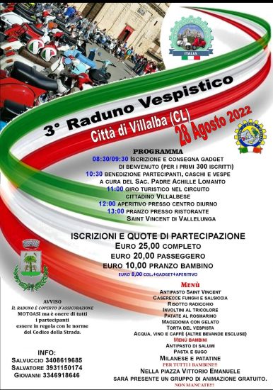 VILLALBA – ”Non c’è due senza tre!!! Il Vespa Club Villalba (CL) dopo aver raddoppiato, adesso rilancia e per la giornata del 28 Agosto 2022, organizza il “3° Raduno Vespistico Città di Villalba” per tutti gli amanti della Vespa e per tutti coloro che vorranno passare una giornata diversa, all’insegna del puro e sano divertimento. L’incontro di amatori, organizzato con il patrocinio del Comune di Villalba, è aperto per chiunque, a bordo del mito a due ruote, vorrà passare una giornata all’insegna dell’allegria “al profumi di miscela”! Tutti soci, appassionati e simpatizzanti, in quella data si ritroveranno in piazza Vittorio Emanuele di Villalba già a partire dalle ore 08:00 per effettuare l’iscrizione all’evento, che comprenderà, a seconda delle scelte degli amici in Vespa, la partecipazione al solo raduno con consegna di gadget, colazione ed aperitivo, o anche al pranzo che sarà effettuato presso il ristorante Saint Vincent nella vicina Vallelunga P.no. Alle 10:30 sarà effettuata la benedizione dei partecipanti, caschi e delle vespe a cura dell’arciprete di Villalba, Sac. Don Achille Lomanto e a seguire i saluti del Sindaco di Villalba Maria Paola Immordino. Subito dopo tutti gli amici vespisti effettueranno un giro turistico per le vie di Villalba e successivamente alle ore 12:00 si recheranno presso il centro diurno di Villalba dove si terrà un mega aperitivo con degustazione di prodotti tipici ed in particolare della famosa lenticchia di Villalba, donate per l’occasione come ogni anno dall’Azienda Agricola TATANO Giuseppe, sapientemente preparate dal grande e sempre disponibile Totò Mazzarisi. Per i più piccoli, gratuitamente nella Piazza Vittorio Emanuele, ci sarà animazione con distribuzione di pop corn e zucchero filato a cura dell’Associazione “Un Mondo a Colori” della vicina Valledolmo (PA). Al termine gli amici in vespa saluteranno la cittadina di Villalba recandosi per il pranzo al ristorante Saint Vincent. Durante il pranzo allietato da musica con balli e karaoke a cura del mitico duo “Salvo e Grace”, saranno effettuate le premiazioni di varie categorie dei partecipanti, scambio di banner trai vespa club intervenuti e consegna di vari premi. Anche quest’anno, come negli eventi precedenti, saranno presenti numerosi Vespa Club siciliani e nazionali per la partecipazione di un numero stimato di almeno 200 vespe. Il Vespa Club Villalba ringrazia anticipatamente lo sponsor Taibi Assicurazioni – agenzia assicurativa plurimarche di Mussomeli per il generoso contributo, i patner tecnici SP Distribution di Siracusa Calogero & C Snc di Villalba, la CASUCCI Snc azienda produzioni premiazioni di Casucci Giuseppe di Agrigento per il loro supporto tecnico e collaborazione, nonchè tutti coloro i quali, a vario titolo, parteciperanno all’evento, chi hanno reso possibile l’organizzazione e la realizzazione del 3° Raduno Vespistico Città di Villalba, prestando volontariamente la propria opera e disponibilità o solo con la semplice vicinanza mostrata.