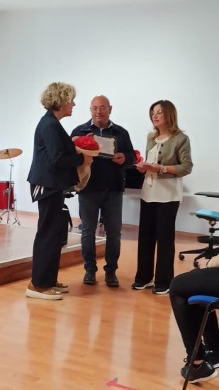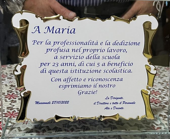 La dirigente Camerota ha anche aggiunto: Maria mi chiedeva spesso il permesso di raccogliere fondi per i più bisognosi, vendendo oggetti frutto della sua arte e della sua maestria, dimostrando cosi di avere non solo le mani ma anche il cuore d’oro. Alle commosse parole della dirigente Camerota hanno fatto seguito il dono di una targa commemorativa su cui è scritto: A Maria, Per la professionalità e la dedizione, profusa nel proprio lavoro a servizio della scuola per 23 anni, di cui 5 anni a beneficio di questa istituzione scolastica. Con affetto e riconoscenza esprimiamo il nostro Grazie! La Dirigente, il direttore e tutto il Personale ATA e docente. Mussomeli 27/102022. E’ stato donato anche un bouquet di fiori mentre i familiari hanno ricambiato con un altrettanto omaggio floreale realizzato dalla stessa Maria e un piccolo contributo per i bisogni di materiale scolastico dei ragazzi frequentanti l’istituto. Da sottolineare che il momento commemorativo della compianta collaboratrice scolastica Maria Taibi è stato accolto con commozione e gratitudine dai familiari che hanno trovato in questo gesto di vicinanza della scuola un conforto al loro dolore, una conferma della grandezza d’animo della loro congiunta e la certezza del suo ricordo che rimarrà sempre vivo nei cuori di chi l’ha conosciuta e amata.