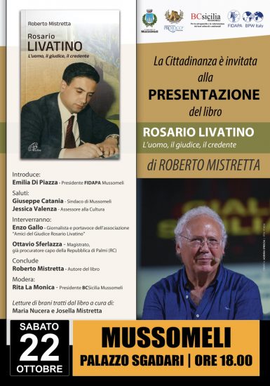 MUSSOMELI – Domani pomeriggio, 22 Ottobre, alle ore 18, nella sala di rappresentanza di Palazzo Sgadari , arà presentato il libro “Rosario Livatino. L’uomo, il giudice, il credente” di Roberto Mistretta. Alla presentazione, oltre all’autore interverranno Ottavio Sferlazza, che da magistrato si occupò delle indagini e dei processi sull’omicidio del Giudice Rosario Livatino, ed Enzo Gallo, giornalista e portavoce dell’associazione “Amici del Giudice Rosario Angelo Livatino” da sempre impegnati nel tenere viva la memoria del primo magistrato elevato agli Onori degli Altari. Introdurrà i lavori Emilia Di Piazza, presidente Fidapa di Mussomeli, cui seguiranno i saluti del sindaco Giuseppe Catania, neo parlamentare regionale; e di Jessica Valenza, assessore comunale alla Cultura. Nel corso dell’incontro saranno letti alcuni brani tratti dal libro e curati da Maria Nucera e Josella Mistretta. Moderatrice sarà Rita La Monica, presidente BcSicilia di Mussomeli, mentre le conclusioni saranno di Roberto Mistretta autore del libro.