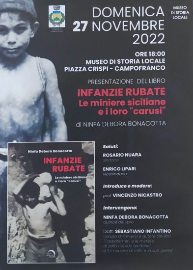 CAMPOFRANCO – Si terrà oggi alle 18 – presso il Museo di Storia Locale nella Piazza Crispi – la presentazione del libro “INFANZIE RUBATE. Le miniere siciliane e i loro “carusi” di Ninfa Debora Bonacotta. Sono previsti i saluti del sindaco Rosario Nuara e del vicesi9ndaco Enrico Lipari. Introdurrà e modererà l’incontro il prof. Vincenzo Nicastro. Interverranno l’autrice del libro Ninfa Debora Bonacotta e il dott. Sebastiano Infantino caruso di miniera e Autore dei libri “Casteltermini e le miniere di zolfo nel suo territorio” e “Le miniere di zolfo e la sua gente”