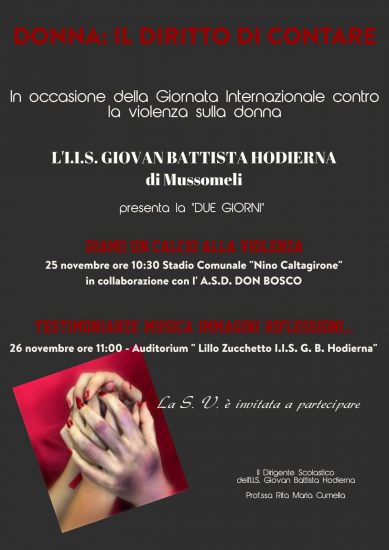 MUSSOMELI – In occasione della ricorrenza della “Giornata internazionale per l’eliminazione della violenza contro le donne” istituita dall’ONU il 17 dicembre 1999, l’I.I.S. “G.B. Hodierna” ha organizzato la due giorni “DONNE: IL DIRITTO DI CONTARE”. Il 25 novembre gli studenti hanno partecipato all’evento sportivo “Diamo un calcio alla violenza”, promosso dall’ASD Don Bosco in collaborazione con la scuola, sfidandosi in un torneo di calcetto presso la palestra comunale. All’ingresso è stata effettuata una raccolta di fondi che sono stati devoluti alla Casa Famiglia “Vanessa”, impegnata nel sostegno a minori in difficoltà. Giorno 26 presso l’Auditorium “Lillo Zucchetto” la tematica della violenza di genere è stata approfondita con testimonianze, musica, immagini e riflessioni che hanno rappresentato un reale momento di crescita umana e culturale per i ragazzi. Significativo il contributo dato dal Capitano Tomaselli, dal Maresciallo Passarello e dall’Appuntato Caserta dell’Arma dei Carabinieri che hanno avuto di modo di far comprendere ai ragazzi l’importanza di denunciare tempestivamente eventuali fatti di violenza consentendo così alle forze dell’ordine di intervenire con fattivo sostegno al contrasto di tale fenomeno, anche alla luce della nuova normativa (c.d. Codice rosso). Inoltre, all’evento hanno preso parte l’Assessore all’Istruzione del Comune di Mussomeli Jessica Valenza, nonché i rappresentanti dell’Associazione BC Sicilia, del collettivo Amarena e della Casa Famiglia “Vanessa” i quali hanno evidenziato l’importanza di tali momenti di riflessione ricordando Monica Diliberto, cara alunna dell’Hodierna. Lo stesso giorno 26 anche gli studenti della sede di Campofranco hanno organizzato una giornata di riflessione scandito in tre momenti: elaborazione di cartelloni, proiezioni di video-testimonianze di donne vittime di violenze ed incontro dibattito con il sindaco, Rosario Nuara e gli assessori Alba Provenzano e Calogero Caltagirone. La scuola ha voluto fare sentire la propria voce per continuare a tenere alta l’attenzione su un fenomeno, purtroppo, in costante aumento e per fare riflettere sulla necessità di portare avanti una cultura del rispetto e della legalità. Tutto ciò in coerenza con quanto significativamente dichiarato dal Presidente Mattarella “…Un’azione efficace per sradicare la violenza contro le donne deve basarsi anzitutto sulla diffusione della prevenzione delle cause strutturali del fenomeno e su una cultura del rispetto che investa sulle generazioni più giovani, attraverso l’educazione all’eguaglianza, al rispetto reciproco, al rifiuto di ogni forma di sopraffazione”.