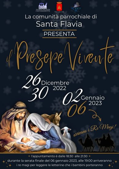 Tutto pronto per la prima edizione de “il Presepe Vivente”, della comunità parrocchiale di Santa Flavia guidata da Padre Calogero La Loggia, che sarà inaugurato il 26 dicembre alle ore 18.30. Gli altri appuntamenti sono in programma, allo stesso orario, il 30 dicembre, il 2 e 6 gennaio (data in cui si svolgerà anche l’arrivo dei Re Magi, con la lettura delle ‘letterine’ dei bambini).
