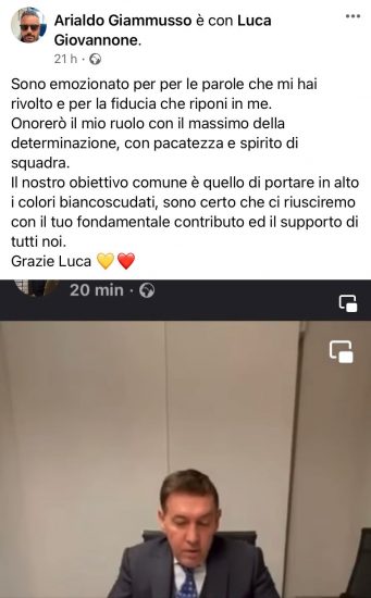 Infatti sono fioccati i “mi piace” ed i commenti degli appassionati di calcio che hanno salutato il rientro di Giammusso che proprio con un post sui social ha raccontato la sua emozione: “Sono emozionato per per le parole che mi hai rivolto e per la fiducia che riponi in me. Onorerò il mio ruolo con il massimo della determinazione, con pacatezza e spirito di squadra.Il nostro obiettivo comune è quello di portare in alto i colori biancoscudati, sono certo che ci riusciremo con il tuo fondamentale contributo ed il supporto di tutti noi. Grazie Luca”