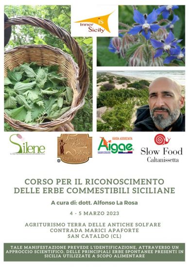 Si terrà a San Cataldo (CL) dal 4 al 5 marzo 2023, il “Corso per il riconoscimento delle erbe commestibili siciliane”, organizzato dall’Associazione di promozione turistica Inner Sicily, dalla Cooperativa Silene con la collaborazione dell’Agriturismo Terra delle Antiche Solfare e di Slow Food di Caltanissetta.