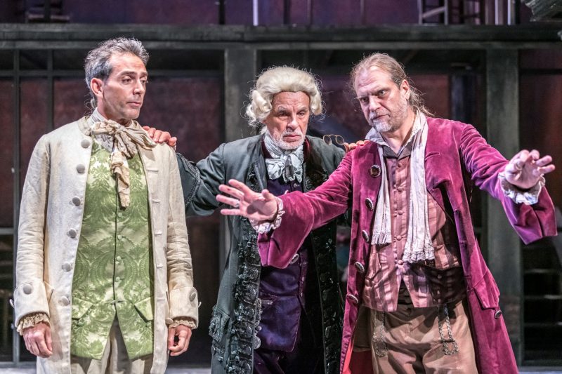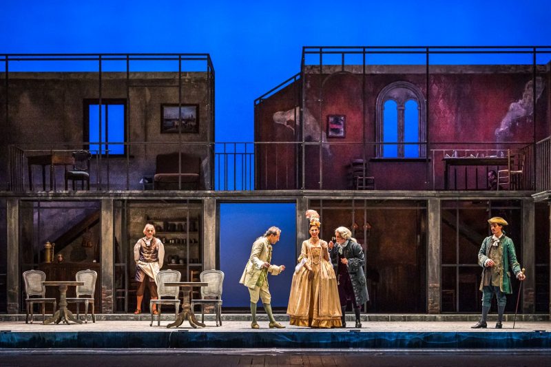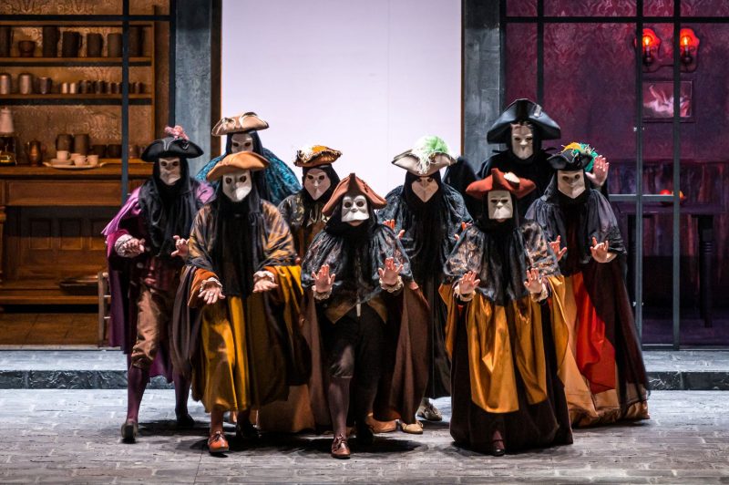 È un campiello veneziano, non particolarmente aristocratico e lì, fra una casa da gioco e una bottega di caffè, si muove una moltitudine di personaggi assieme ad un grande protagonista, Don Marzio. Ma – e in questo si riconosce, a mio avviso, la grande qualità della commedia – ognuno di loro possiede, nel disegno di Goldoni, una qualità straordinaria: l’autore riesce a tratteggiare ogni figura attraverso sfumature e intrecci che alla fine le rivelano”. Lo spettatore seguirà per una giornata intera, durante il carnevale, il piccolo mondo che popola il campiello veneziano. Tra virtù e lati oscuri le varie vicende conducono a Don Marzio, il nobile napoletano interpretato dal bravissimo e carismatico Michele Placido, che osserva seduto al caffè questo piccolo mondo e con malizia ne intriga i destini. Lui si rivelerà la chiave della commedia, un personaggio ambiguo e alla fine catartico. Lo attorniano una coralità di figure, tutte importanti, ognuna ambigua e interessante, che interagiscono tra loro donando allo spettacolo un ritmo vorticoso.