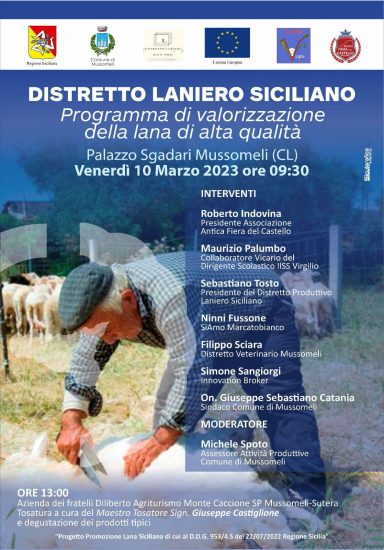 MUSSOMELI – Previsto a Mussomeli presso il Palazzo Sgadari, venerdì 10 marzo alle ore 9:30, un incontro sulla valorizzazione della lana di alta qualità. Incontro organizzato in relazione alle iniziative previste nel partenariato tra il Distretto Produttivo Laniero Siciliano, l’amministrazione comunale, altri comuni e partner. Sono previsti gli interventi di Roberto Indovina Presidente Antica Fiera del Castello, Maurizio Palumbo collaboratore vicario del dirigente scolastico IIS Virgilio, Sebastiano Tosto, Presidente del Distretto Produttivo lattiero Siciliano, Ninni Fussone SiAmo Marcatobianco, Filippo Sciara Distretto Veterinario Mussomeli, Simone Sangiorgi Innovation Broker, on. Giuseppe Catania sindaco comune di Mussomeli. Moderatore dell’incontro è l’assessore alle Attività Produttive e Agricoltura Michele Spoto. Alle ore 13, nell’Azienda dei fratelli Diliberto Agriturismo Montecaccione SP Mussomeli-Sutera è prevista la tosatura a cura del Maestro tosatore Giuseppe Castiglione e degustazione prodotti del territorio.