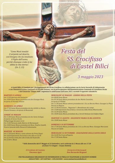 CASTEL BILICI – Con l’apertura alle ore 15,30 del Santuario di ieri 25 aprile 2023 e la successiva celebrazione della Messa, presieduta dall’arciprete di Petralia Sottana don Giuseppe Murè, è stato dato l’avvio alle celebrazioni di riti religiosi fino al 24 settembre prossimo, come espressamente indicato nel programma diffuso, da qualche giorno, e firmato dall’Arciprete di Marianopoli don Bernardo Briganti e dal Presidente del Comitato festeggiamenti del SS.Crocifisso di Castl Bilici Vincenzo Agrò. Intanto è questo il programma dei festeggiamenti, in collaborazione con la Curia vescovile di Caltanissetta, e con l’Amministrazione comunale di Petralia Sottana, con la partecipazione dell’Amministrazione comunale di Castellana Sicula e del Consorzio “Cinque Valli”: domenica 30 Aprile 2023 alle ore 17,30 Santa Messa presieduta da Padre Achille Lomanto, Vicario Foraneo e Arciprete di Mussomeli; lunedì 1° maggio, ore 11, Santa Messa presieduta da don Santo Scileppi, arciprete di Geraci Siculo; Pellegrinaggi dai paesi vicini; ore 15, partenza dalla Madrice di Marianopoli, ore 18,00 Santa Messa presieduta da mons. Onofrio Castelli, Vicario Generale della Diocesi di Caltanissetta; martedì 2 maggio, 0re 17,30 celebrazione dei Primi Vespri; ore 18,30 Esposizione Eucaristica sino alle 22,30; ore 22,30 fiaccolata fino alla Grotta del Pastorello; ore 22, Santa Messa. Mercoledì 3 maggio – giorno della festa – : 0re 8 Santa Messa; ore 9,30 Santa Messa presieduta da Padre Marko Cosentino, Arciprete di Villalba; ore 11,30 Santa messa presieduta da S.E.Rev.ma mons. Giuseppe La Placa vscovo di Ragusa; ore 12,30 Processione, “Rogazioni” e benedizione dei Campi; ore 15, Esposizione Eucaristica e Coroncina della Divina Misericordia; ore 16,30 Santa Messa; ore 18, Santa Messa presieduta da P.Imrick Nesiusan da Sclafani Bagni. Martedì 15 Agosto Solennità di Maria SS. Assunta, ore 18 Santa Messa. Domenica 10 settembre, Santa Messa presieduta da S.E. Rev.ma mons. Giuseppe Marcianti, vescovo di Cefalù. Mercoledì 14 settembre Via Crucis all’aperto e alle ore 17,30 Santa Messa.