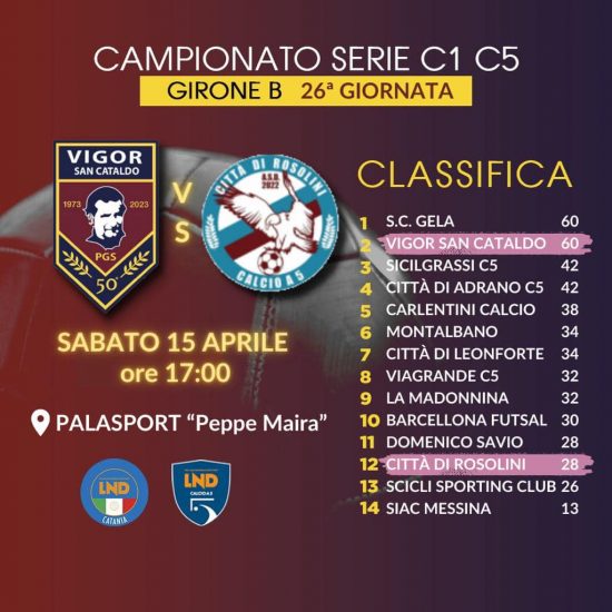 Finale thrilling, degno di un film di Alfred Hitchcock, quello della serie C1 di futsal, girone B, che vede appaiate in cima alla graduatoria Pgs Vigor San Cataldo e Gela con 60 punti.