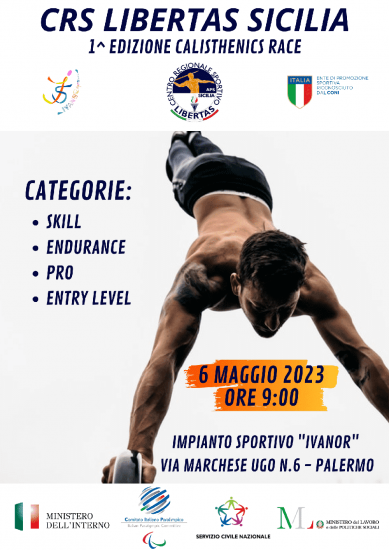 Con il patrocinio della Libertas, l’ente di promozione sportiva riconosciuto dal CONI, la “Società Sportiva Dilettantistica Ivanor” di Palermo organizza la manifestazione denominata “Calisthenics Race”, la ginnastica di tendenza che sta conquistando sempre più appassionati. Ricco il programma delle gare che si svolgeranno il prossimo 6 maggio a Palermo con inizio alle ore 9 nella palestra dell’impianto sportivo “Ivanor” di via Marchese Ugo n.6.