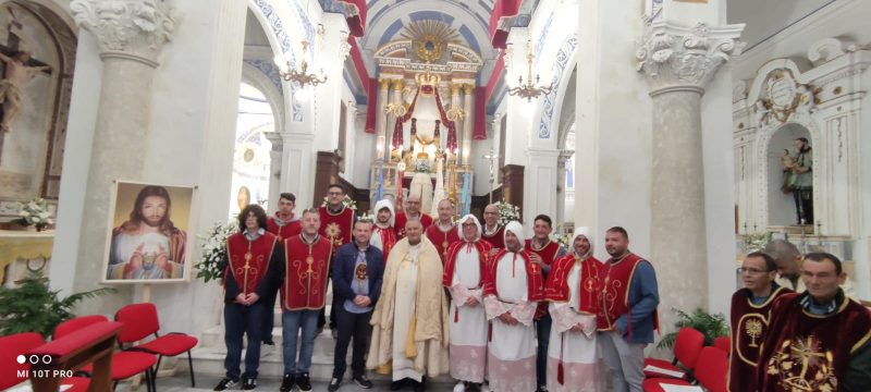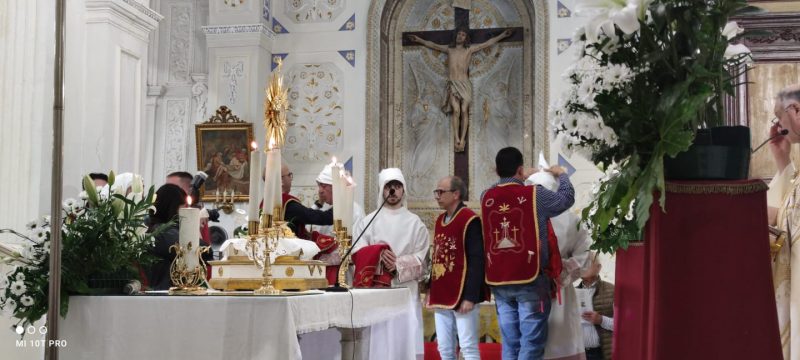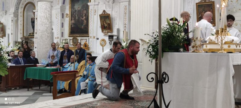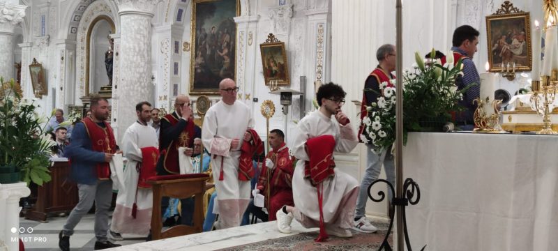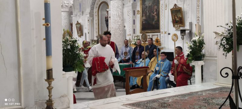 MUSSOMELI – In un clima di gioiosa partecipazione, durante la celebrazione dei Vespri nella solennità del Corpus Domini, a cui hanno partecipato le Autorità civili e militari, si è svolto il tradizionale rito della “cantata dei Fratelli”, presieduto dall’Arciprete Padre Achille Lomanto. I quattro novizi, che hanno concluso l’anno di noviziato, sono Michele Schifano, Osvaldo Barba, Dennis Fregapane e Catanese Pasquale; hanno indossato gli abiti confraternali e, al termine della funzione religiosa, hanno sorretto il baldacchino, accompagnando processionalmente, all’interno della chiesa, il SS. Sacramento nella sua cappella. Altri aspiranti confrati, hanno, invece, hanno indossato l’abitino e ricevuto copia dello statuto. Questi i loro nomi. Mario Buttaci, Tanino Buttaci, Calogero Calà, Giuseppe Di Carlo, Matteo Indelicato, Alberto Mistretta, Antonella Piazza, Ivan Ravizzone. (2 Video)