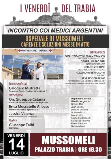 MUSSOMELI – Continuano assai partecipati i venerdì del Circolo Trabia – Paolo Emiliani Giudici – in Piazza Roma, diretto da Calogero Mistretta, ritornato alla guida dell’antico sodalizio. Un venerdì, dove si è respirata aria argentina con la presenza di medici di quella nazione, giunti a Mussomeli per svolgere il lavoro presso l’Ospedale di Mussomeli, da tempo, privo di tali figure professionali. Un arrivo a Mussomeli che li ha colmati subito di simpatia della gente e soprattutto per avere scelto Mussomeli come attività lavorativa presso l’Ospedale che da tempo non è riuscita a darele idonee risposte all’utenza, in continua preoccupazione per i mancati servizi in campo sanitario. Un incontro dunque che ha visto al tavolo della presidenza, il moderatore giornalista Peppe Taibi, Il Presidente del Circolo Calogero Mistretta, il sindaco di Mussomeli onorevole Giuseppe Catania, Erica Moscatello Allocco (esperta consulenza Agenda 2030), Hanno parlato in tanti, anche fra il pubblico presente, durante l’incontro, dove è stato possibile ascoltare direttamente i fatti per l’arrivo di questi medici argentini che hanno tenuto banco nella stampa locale e nazionale. Da dire subito che ci sono state le testimonianze dei medici Gustavo Javier Nizzo Miguens (ortopedico/traumatòlogo)., di Gabriel Pablo Miri (internista geriatra), di Luciano Verrone (ortoopedico/traumatologo), di Alejandro Bertolotti (Chirurgo), Saverio Sciarrino ( responsabile U.O. Medicina Generale e Presidente Commissione consiliare Sanità. Ospiti della serata i medici argentini :Gabriel Miri, Juan Bossio, Luciano Verrone, Gustavo Nizzo, Laura Lator, Alejandro Bertolotti, Francisco Perejra, Martin Venturini, Gabriela Merip. Un incontro al “Trabia” dal sapore di una festa di accoglienza e di auspici per il buon funzionamento del “M.I.Longo” di Mussomeli. (IL VIDEO E LE INTERVISTE).