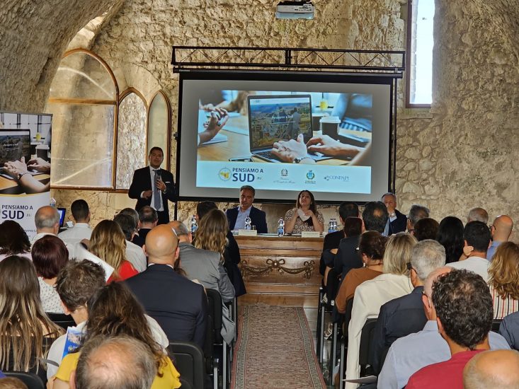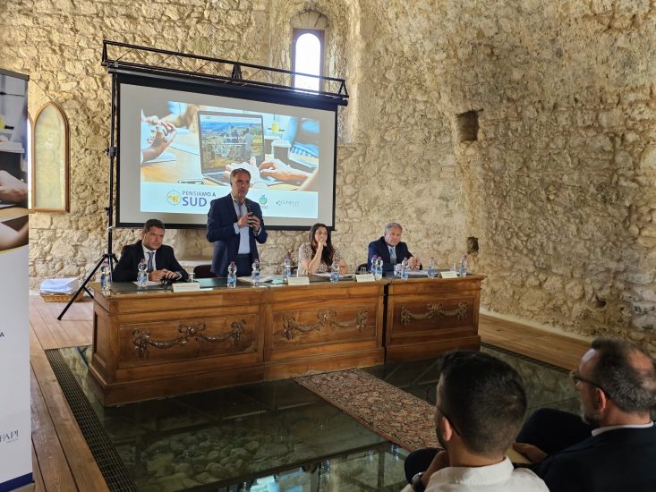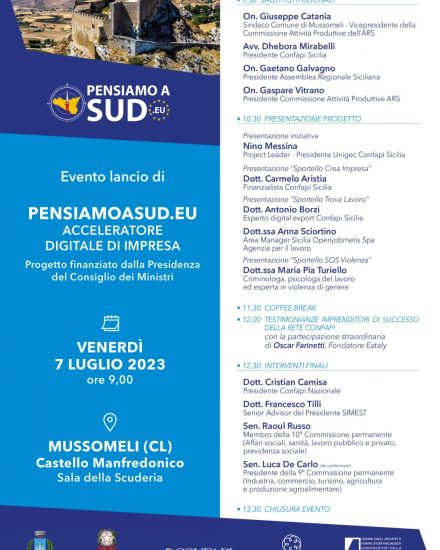 MUSSOMELI – Organizzato dal Comune di Mussomeli e Confapi Sicilia si è svolto il Convegno “ PensiamoalSud” tenutosi, presso la scuderia del Castello Manfredonico nella giornata del 7 luglio 2023. Erano presenti il presidente dell’ARS On. Gaetano Galvagno , il presidente della Commissione Attività Produttive On. Gaspare Vitrano, il componente della 10^ Commissione Senato della Repubblica Sen. Raul Russo, il sindaco di Mussomeli on. Giuseppe Catania, l’avv. Dhebora Mirabelli e Confapi Sicilia. Presenti le autorità civili e militari, assessori e consiglieri comunali, diversi professionisti e l’ordine dei dottori commercialisti e Architetti della Provincia di Caltanissetta.( IL VIDEO DELL’INTERO INCONTRO E LE INTERVISTE prima e dopo l’incontro)