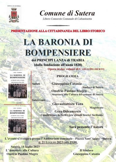 SUTERA . L’amministrazione di Sutera, insediatasi da 2 mesi, apre le attività culturali con la presentazione del libro la baronia di Bompensiere di Carlo Diliberto. L’altro ieri alle 19.30, presso la sala ex Agonizzanti si è tenuta un incontro prettamente culturale, assai partecipato, durante il quale il Sindaco Giusy Catania e il vicesindaco Onofrio Magro hanno presentato l’evento. Presente, oltre lo scrittore Carlo Diliberto, lo storico cittadino Gero Difrancesco.
