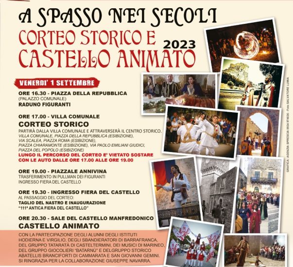 MUSSOMELI – L’1 e il 2 settembre sono alle porte e le giornate castellane prevedono le seguenti attività. Venerdì 1 settembre ore 16,30 Raduno dei figuranti al Palazzo Comunale in Piazza della Repubblica dove ci sarà la prima esibizione ; Partenza in direzione del centro storico, alle ore 17, con attraversamento della villa comunale, Via Scalea e Piazza Roma, dove seguirà la seconda esibizione; si proseguirà per la Piazza Manfredi Chiaramonte con un’altra esibizione: Il corteo poi attraverserà la Via Paolo Emiliani Giudici fino a raggiungere Piazza del Popolo dove ci sarà l’ultima esibizione. Lungo questo attraversamento non sarà possibile sostare con le automobili dalle ore 17 alle ore 19. E proprio alle ore 19 è previsto dal Piazzale Annivina il trasferimento in pullman dei figuranti fino all’ingresso fiera del Castello; alle ore 19,30, al passaggio del Corteo storico, è previsto il taglio del nastro ed inaugurazione della 111^ “Antica Fiera del Castello” : Dalle ore 20,30 il castello sarà animato ed è prevista la collaborazione degli alunni dell’Hodierna e del Virgilio, degli sbandieratori di Barrafranca, del gruppo Tataratà di Casteltermini, dei musici di Marineo, del gruppo giovolieri di Baternù e del gruppo storico Abbatelles Branciforti di Cammarata e San Giovanni Gemini. Collaborerà all’iniziativa Giuseppe Navarra. Il 2 settembre – Festa religiosa della Madonna della Catena: ore 7,30 /11,30 Sante Messe – ore 18,00 Santa Messa; ore \9,00 Processione.