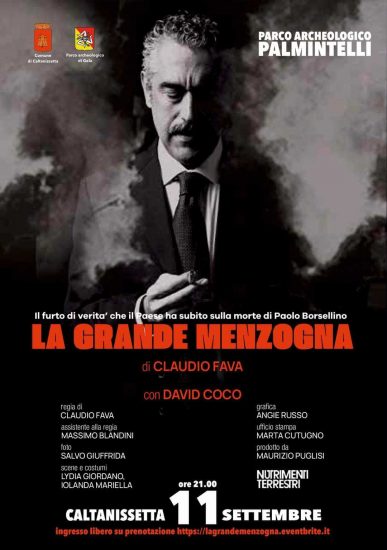 Lunedì 11 settembre, “La Grande Menzogna”, spettacolo di Claudio Fava interpretato da David Coco e prodotto da Nutrimenti Terrestri, andrà in scena al Parco Archeologico Palmintelli nel cuore di Caltanissetta. Dopo il debutto dello scorso luglio al Tindari Festival e la successiva tappa messinese al Cortile Teatro Festival, i fatti, le contraddizioni e i misteri che ruotano attorno al depistaggio Borsellino giungono nel nisseno grazie all’ultimo lavoro teatrale di Fava ed in un luogo particolarmente simbolico.