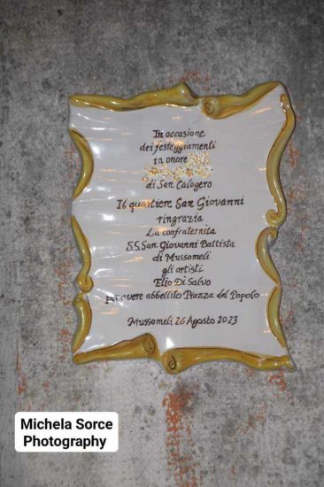 MUSSOMELI – Nella serata del 22 settembre 2023, al termine delle celebrazione serale della parrocchia di San Giovanni preparazione della ricorrenza liturgica di San Pio, nella circostante Piazza del Popolo, la confraternita SS.Sacramento col suo presidente Vncenzo Bertolone e ia dirigenza, presente il parroco Padre Francesco Miserendino, hanno scoperto la targa commemorativa per ricordare la giornata di arte e rigenerazione urbana avvenuta in Piazza del Popolo il 26 agosto scorso, durante la quale gli artisti locali, argentini e ucraina hanno dipinto i vasi donati e collocati dal compianto Elio Di Salvo nell’anzidetta Piazza. Presente anche la moglie Giusy Castiglione che ha voluto ringraziare gli artisti per l’amorevole attenzione dimostrata nei confronti di Elio Di Salvo.. Questi gli artisti premiati. , Luigi mangiapane, Enza Messina, Cecilia Solari, Enza Bonfante, Sole Salvina , Karen Avila , William Avila , Miguel Avila , Rosanna Sorce, Ladduca Salvatore, Totuccio Pellitteri. Rosy Calà, Salvatore Sorce, Richard Wagner, Filippo Misuraca , Giovanni Misuraca, Nomgaladze Sofia , Cettina Sola, Salvina Piazza, Josella Mingoia, Voloshyna Vera. Ha coordinato l’incontro Gero Mario Taibi.