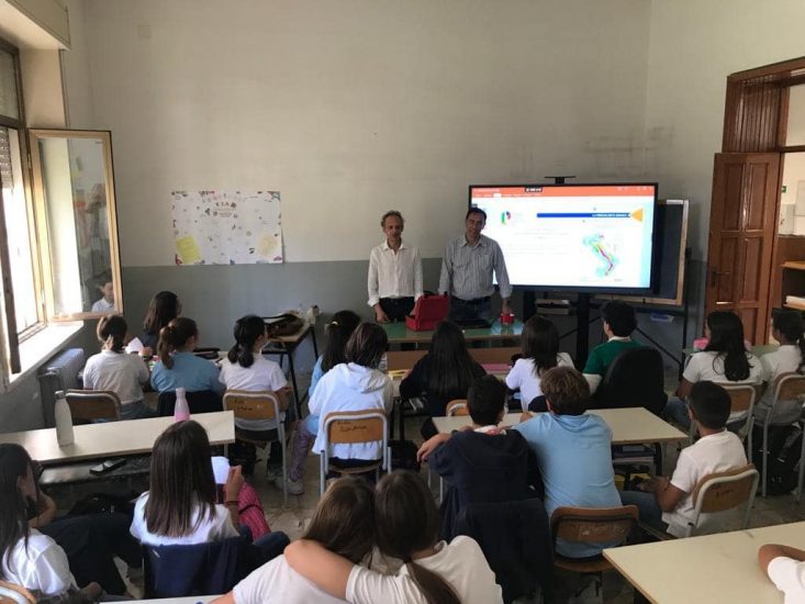 MUSSOMELI – All’Istituto comprensivo “Leonardo da Vinci” di Mussomeli si è svolto, con il gradimento entusiastico e la partecipazione attiva degli alunni, il geoevento dal titolo “GeoRischio”, la XI edizione della settimana del Pianeta Terra, festival scientifico che coinvolge tutta l’Italia dal 2012 e principale appuntamento condiviso di comunicazione pubblica delle Geoscienze. Il festival scientifico quest’anno si è svolto in tutta Italia dall’1 all’8 ottobre. La giornata ha visto impegnate le classi seconde e terze della scuola secondaria di primo grado del plesso di Mussomeli e del plesso di Campofranco. Dopo l’accoglienza calorosa della Ds prof.ssa Alessandra Camerota, la conferenza è iniziata con la lectio magistralis della prof.ssa Giovanna Scopelliti, docente di Petrografia presso il dipartimento delle Scienze della Terra e del Mare dell’Università degli Studi di Palermo. La docente universitaria ha affrontato l’argomento della tettonica a placche, spiegando con efficace chiarezza come la Sicilia, ubicata al centro del Mediterraneo, rappresenti un segmento dell’orogene appenninico-maghrebide, che collega l’Appennino al Nord-Africa, attraverso l’Arco Calabro-Peloritano e che, unitamente al suo margine tirrenico, costituisce un’area geologica in cui sono presenti varie unità tettoniche derivanti da differenti domini paleogeografici. Con riferimento al tema della prevenzione e del “Georischio”, gli alunni hanno inteso come la nostra regione è così esposta ai rischi geologici, in quanto è collocata lungo la zona di contatto tra l’Europa e l’Africa che si stanno avvicinando ad una velocità di 7 millimetri per anno. La placca africana e quella europea si scontrano, causando la rottura delle rocce lungo le faglie e che ne determinano l’attuale pericolosità sismica e vulcanica. La professoressa si è poi soffermata sulla crisi di salinità del Mediterraneo che ha portato alla genesi della serie evaporitica, di età miocenica superiore, che troviamo a Mussomeli e nell’area del Vallone, e alle vicissitudini tettoniche che l’hanno intensamente deformata con pieghe e faglie. Da Urbino si è collegato con la conferenza il prof. Rodolfo Coccioni, professore onorario dell’Università di Urbino, nonché presidente dell’associazione “Settimana del Pianeta Terra” che ha parlato del Green Drop Award 2023, ovvero del prestigioso trofeo assegnato da Green Cross Italia al film, fra i 21 in gara nella selezione ufficiale della Mostra Internazionale di Arte Cinematografica di Venezia, che “meglio abbia interpretato i valori dell’ecologia e dello sviluppo sostenibile, con particolare attenzione alla conservazione del pianeta e dei suoi ecosistemi per le generazioni future, agli stili di vita e alla cooperazione fra i popoli”. Il trofeo Green Drop Award consiste in una “grande goccia d’acqua” realizzata dal maestro vetraio Simone Cenedese di Murano. Ogni anno, questa goccia contiene un campione di terra proveniente da un luogo significativo del pianeta. Quest’anno, la terra proviene dalla villa di Galileo ad Arcetri (Firenze) per commemorare i 400 anni dall’uso della parola “ambiente” nell’opera “Il saggiatore” di Galileo Galilei, pubblicata nel 1623. Il professore Coccioni ha poi invitato gli alunni a visionare i due film vincitori: “Il confine verde” di Agnieszka Holland e “Io Capitano” di Matteo Garrone. La seconda parte del Geoevento è stata dedicata all’attività laboratoriale con il contributo del geologo Carmelo Orlando che, dopo aver illustrato i vari metodi d’indagine sismica, ha eseguito in aula l’acquisizione del rumore sismico con tromografo digitale per rilevare, in diretta, la velocità delle onde di taglio. Gli alunni hanno generato un microtremore sbattendo i piedi a terra e visualizzando sullo schermo lo spettro delle frequenze. Durante la fase laboratoriale, gli alunni hanno mostrato il funzionamento di diversi sismografi verticali, da loro costruiti utilizzando semplici materiali; i ragazzi hanno in pratica simulato un terremoto facendo vibrare il tavolo e i sismografi e hanno generato il sismogramma su un rullo di carta. La parte laboratoriale si è conclusa con la visione delle cartografie di rischio e di pericolosità del PAI (Piano per l’Assetto Idrogeologico) della Regione Sicilia, sia del territorio di Mussomeli che di Campofranco. La Dirigente scolastica, alla fine dei lavori, ha consegnato ai relatori una targa ricordo per l’importante contributo scientifico offerto e ha ringraziato, per l’organizzazione del Geoevento, i docenti di scienze Anna Maria Scozzaro, Francesco Di Franza, Luigi Morreale e Angelo Alfano, quest’ultimo nella sua qualità di coordinatore dello stesso. E con piena soddisfazione ha concluso: “E’ un fatto educativo rilevante quello di potere sensibilizzare gli alunni alle tematiche dei rischi presenti nei territori di Mussomeli e di Campofranco, nell’ottica della prevenzione e del rispetto delle “leggi sovrane” della natura, offrendo così una corretta informazione e preparazione scientifica ai ragazzi, con lo scopo di diffondere una produttiva cultura del territorio e favorendo la possibile convivenza con i rischi naturali, limitandone così il potere distruttivo”. ( Responsabile comunicazione esterna I.C.S. “Leonardo da Vinci”prof. Tonino Calà)