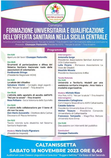 l’Associazione di Promozione Sociale ” Noi per la salute “- Tina Anselmi, in occasione del I° Anniversario della sua costituzione organizza il Convegno dal titolo :” Formazione Universitaria e Qualificazione dell’Offerta Sanitaria nella Sicilia Centrale “.Il Convegno, di cui allego il programma, si terrà a Caltanissetta Sabato 18 Novembre alle ore 9,00 presso la Sala Convegni del Liceo Classico ” Ruggero Settimo ” sito in Via Rosso di San Secondo. Il Convegno affronterà, grazie agli interventi di esperti, sia con relazioni che con tavole rotonde tematiche legate al ruolo delle associazioni di volontariato quali strumenti di partecipazione e difesa del Servizio Sanitario Nazionale, tematiche relative alla gestione delle problematiche sanitarie dei pazienti con disabilità e tematiche legate alla connessione tra Università e Territorio e alle possibili implicazioni nella istituzione di modelli organizzativi di assistenza sanitaria nel contesto di una Area Vasta.Le sarei particolarmente grato se vorrà darne ampia diffusione per mezzo della sua testata giornalistica pubblicando sia questa mia lettera che la locandina dell’evento.Ringraziando per la cortese attenzione, porgo i più cordiali salutiGiuseppe PastorelloPresidente A.P.S. ” Noi per la salute “- Tina Anselmi