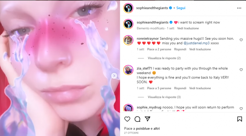 Con una nota dal suo profilo Instagram “sophieandthegiants” l’artista londinese aveva annullato e posticipato a data da destinarsi gli eventi di quel weekend tutto italiano.