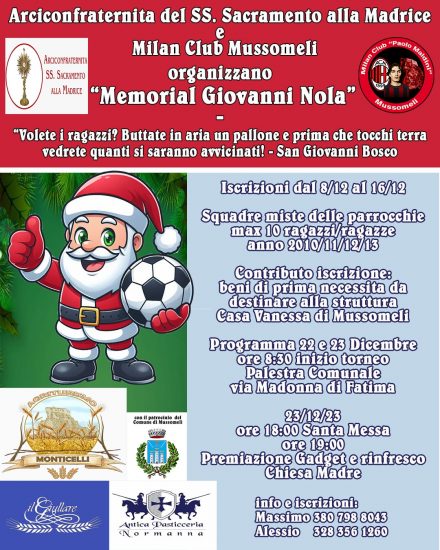 MUSSOMELI – Coniugare formazione, sport e solidarietà, in ossequio alle finalità proprie dei sodalizi in campo, significa espletare concretamente il ruolo fondante che ha dato origine alle loro istituzioni. E così, in questo ultimo scorcio dell’anno, nel mese di dicembre, quando ogni cosa è riconducibile all’Attesa e alle feste di fine anno (Natale Capodanno Epifania), anche l’Arciconfraternita della Madrice, unitamente al Milan Club, trovano spazio per trasmettere valori irrinunciabili che profumano di formazione, di umanità, di fratellanza e di solidarietà. E lo fanno, mettendo in campo con il “Memorial Giovanni Nola” un torneo di calcio per i ragazzi/ragazze max 10 (anno 2010 – 2011 – 2012 – 2013) con squadre miste delle parrocchie con l’invito ai partecipanti di provvedere alla quota di partecipazione donando prodotti di prima necessità da destinare al sodalizio Casa Vanessa. Insomma un sano divertimento per ricordare il giovane Giovanni Nola, rimasto nel cuore di quanti gli hanno voluto bene. Questo il programma: 22 e 23 dicembre : ore 8,30 inizio Torneo Palestra Comunale Via Madonna di Fatima. Il 23 dicembre nella Chiesa Madre: alle ore 18, Santa Messa; alle 19 Premiazione Gadget e rinfresco.